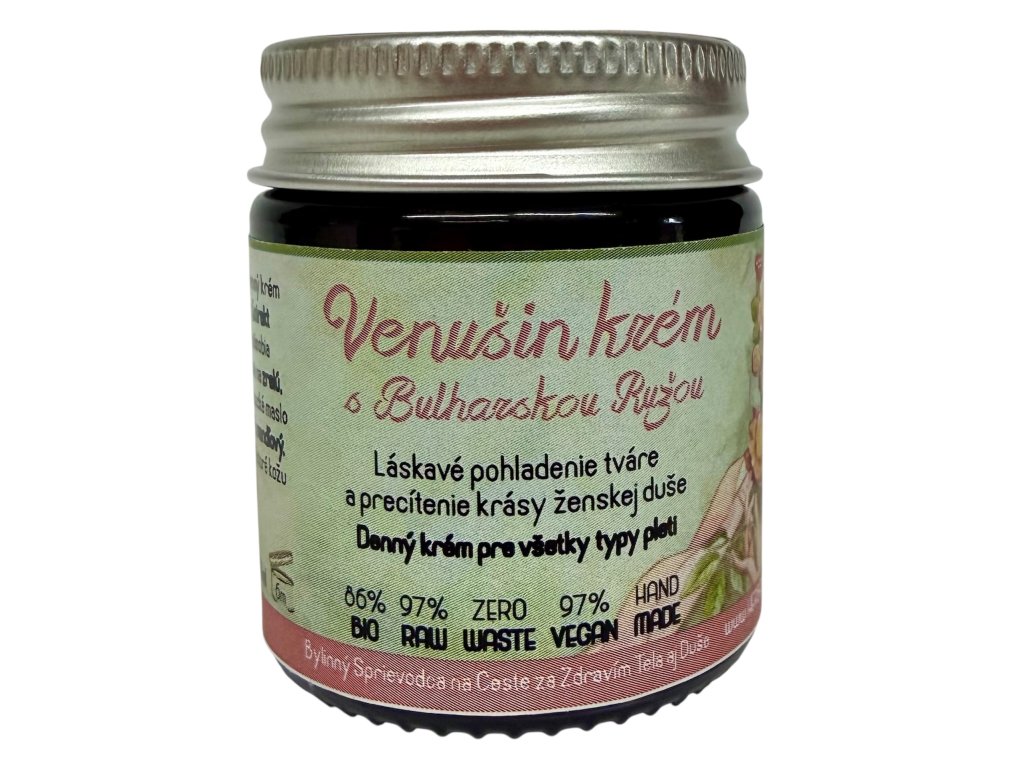 Základom krému je vzácny esenciálny olej absolut a ručne vyrobený extrakt z lupeňov Ruže Damašskej, ktorý už niekoľkými kvapkami dodá každej kozmetike punc bohyne lásky a krásy, tak ako Venuša, ktorá podľa antickej mytológie bola stvorená spolu s posvätným kvetom ruže. Preto aj tento krém nesie názov po Venuši, aby spojením účinkov rastlín a symbolov povzbudil našu sebelásku a sabahodnotu a pomohol nám nájsť rovnováhu krásy duše a tela. Pohladenie od Venuše pocítite už po prvom použití tak, ako dosvedčujú komentáre žien, ktoré krém vyskúšali.